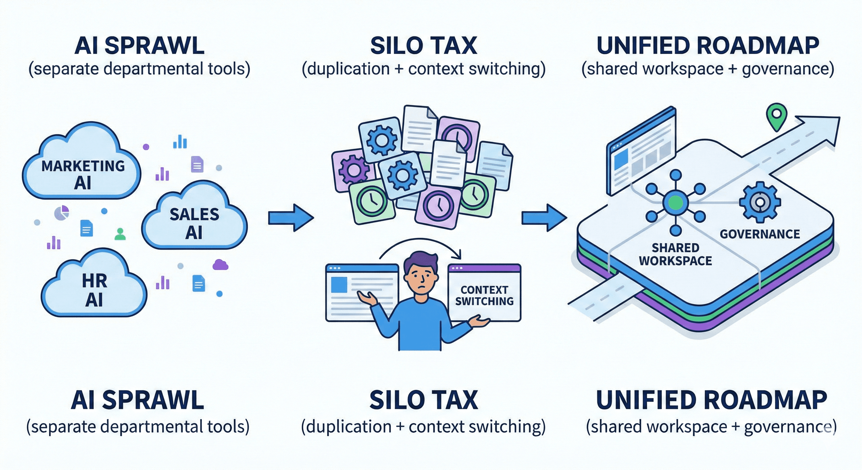 The AI silo tax is the operational drag that shows up when AI tools, data, and initiatives are isolated by department.