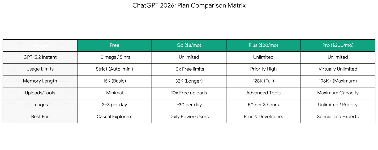 “Create a clean comparison diagram showing Free vs Go vs Plus vs Pro: focus on GPT‑5.2 Instant access, usage limits, Memory length, uploads, images, and who each plan is best for.”