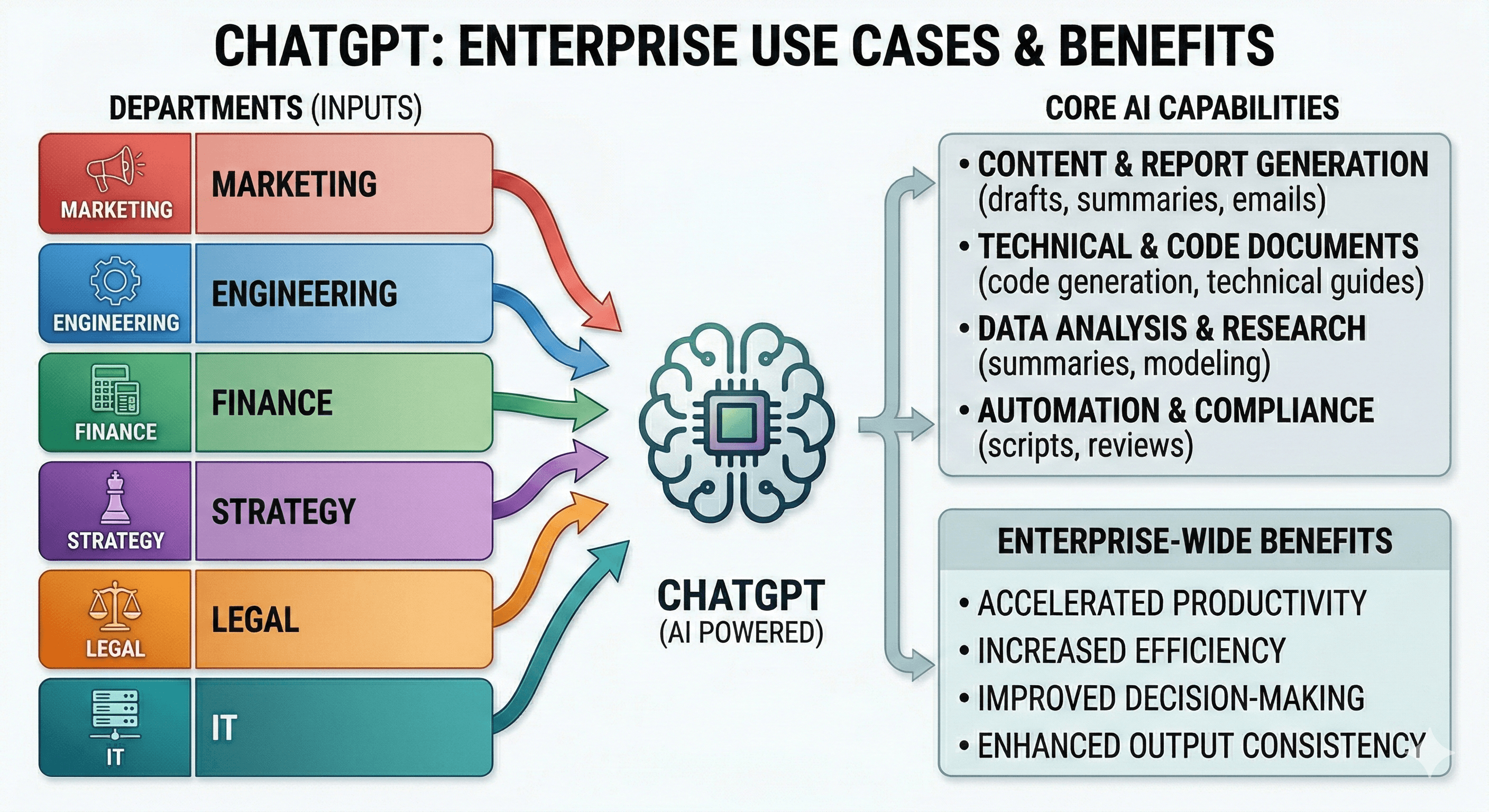 “Department use case map”: marketing/engineering/finance/strategy/legal/IT → outputs.