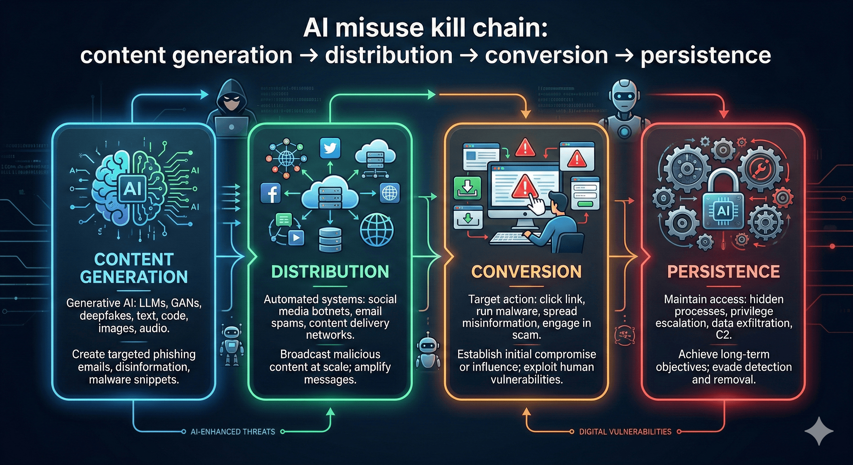 Malicious AI can scale phishing and fraud, generate misinformation at volume, support reconnaissance, and enable synthetic media (deepfake voice/video) that undermines trust.